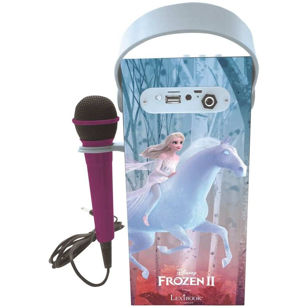 Boxă karaoke portabilă puternică cu design Frozen. Efecte luminoase pentru a crea o atmosferă de petrecere oriunde te afli, singur sau cu prietenii. Conectivitate Bluetooth: Funcționează wireless cu smartphone-uri, tablete și alte dispozitive audio compatibile Bluetooth. Cu microfonul inclus, boxa devine un aparat de karaoke pentru a cânta melodiile tale preferate. Adaugă efecte vocale microfonului tău cu funcția ecou. Redă în flux muzica sau podcasturile de la orice sursă audio cu ajutorul porturilor USB, cardului micro SD/TF (până la 32 GB) și porturilor auxiliare de intrare. Ia-o oriunde cu mânerul și bateria reîncărcabilă (1200mAh) folosind cablul micro USB (inclus).